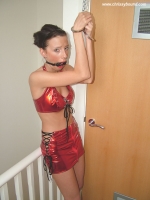 Apparently some of the new clothing that Chrissy had purchased wasn't to some people's liking, so here, we dressed her in a tight PVC outfit for you. She looks like a total sex object ready to be used and abused. Her wrists are handcuffed in front of her to a chain suspended from the ceiling and she's ring-gagged.