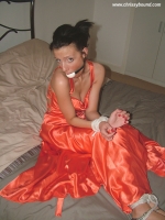 She was wearing a lovely orange dress as if she was ready to go to the ball. She's though instead bound on a bed and also blindfolded. She really didn't like the huge white ball-gag that was strapped tightly in my mouth, but we thought it looked awesome so wanted to use it anyway.