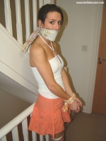 After the last set, her ankles and knees are freed from the bondage tape and her blindfold is removed as she is led downstairs. Still with her original gag in place, now gagged for over 45 minutes! This is reinforced and her wrists are bound with a scarf in front of her. She would be tasting the cum that was soacked into the cloth she'd been gagged with by now, but she's very used to that taste so might not have noticed.