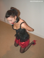 She's wearing the sexy black corset again, once more this is with the red skirt, black tights and red heels. She has a strong leather harness binding her wrists behind her and then a red ball-gag in her mouth keeps the bitch quiet. Made to kneel she can't stop herself drooling, but then that's what we do with fuck whores like you Chrissy.