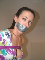 A sight that every member of the site seems to want, yet so many in real life have already seen, Sabrina spread-eagle on the bed. She is wearing a pink negligee and pink underwear leaving little to the imagination. Her ankles and wrists are bound with pink rope and she is gagged with a strip of red tape.