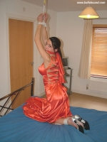 She is wearing a very sexy long orange evening dress, the back detail is particularly nice to look at with the various straps across her back. Her ankles are tied together and her wrists are also bound in front of her. She is cleave gagged with the shawl from the dress and put into a kneeling position which is somewhere she's very familiar with.
