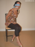 In this set something rare happened, we allowed one of our models to wear something other than a skirt or a dress! Still, sexy footless tights with a pretty top over them is very close to status quo! Sabrina is handcuffed, cleave gagged and blindfolded sitting on a chair.