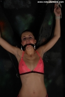 As sexy Sophia struggles to get free from her predicament, it was just so easy to ensure her situation was that bit worse. A knotted cloth is bound tightly between her lips and teeth into a cleave-gag keeping her quiet. She continues to try and get free though.