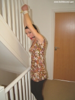 In the final part of this set, Sophie is bound into a sitting strappado with her wrists pulled up behind her putting her in a very uncomfortable position. The situation is made worse for her as her top is undone revealing her breasts as she's unable to stop it happening!