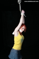 Wearing her cute yellow t-shirt and denim skirt, Fi was looking far too relaxed. So her wrists are wrenched up above her head and tied to the ceiling. She is also gagged with a cloth in her mouth held in place with another cloth.