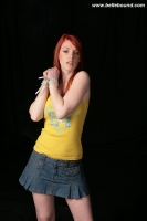 Raunchy redhead Fi wears black mini skirt, heels and white top in the second part of this set. Fi is bound at the ankles, wrists and knees with tight white rope. We decided more is needed and fit her with a large leather harness ball gag.