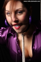In the second part of this set we see Sophia in her turquoise and polka dot underwear on the sofa. She is bound with leather straps at the ankles, knees and with her wrists behind her back. She is now ball gagged with a large black ball gag keeping her silent.