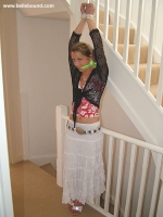 Gypsy girl Sabrina is bound on the landing, her wrists are bound and pulled high above her head. Her ankles are also bound tightly and she is cleave-gagged with a strip of green cloth.